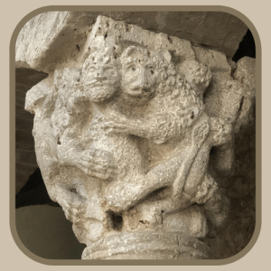 Sul capitello sono rappresentate figure umane e animali avvinghiate le une alle altre in un mortale abbraccio dove i corpi si fondono e si confondono gli uni con gli altri in una sorta di anticipazione di quelle danze macabre, dove gli animali sono sostituiti da scheletri, che caratterizzeranno i palinsesti pittorici delle chiese dopo la grande peste del 1348, che infuriò in tutta Europa e rese la morte un fenomeno familiare. Sul capitello si riconoscono tre felini, a giudicare dalla criniera leoni con occhi e fauci spalancate che trattengono, in una sorta di concatenazione di corpi, due figure umane le cui teste di profilo figurano tra i musi degli animali. La rappresentazione di creature fantastiche zoomorfe, mostruose e immaginarie è da sempre una costante nell’arte, soprattutto nella scultura e nella pittura, ma nel medioevo sembra accentuarsi la loro presenza. Il retaggio è arcaico: proviene dall’arte greca e romana e ancor prima da quella sumerica dove, fondendo insieme parti diverse di diversi animali si aveva l’illusione di acquisirne, proprio attraverso le diverse parti, le caratteristiche fisiche quali potenza, velocità, forza…
