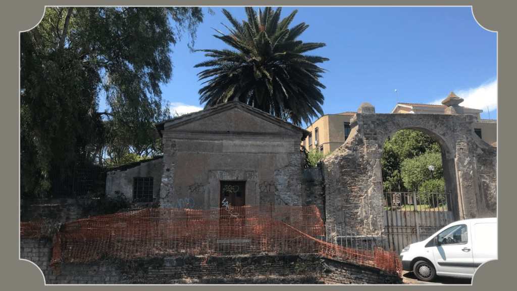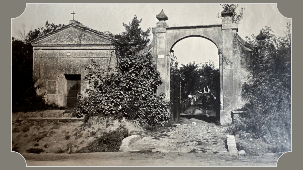 Riguardo il mausoleo, invece, che fine può aver fatto? Se alziamo lo sguardo vediamo come il gradino serva una piccola cappella in apparente stato di abbandono perfettamente rispondente alle misure del cippo. Niente di più facile che trasformare un piccolo mausoleo abbandonato in una cappelletta di campagna per i pastori o i viandanti che si recavano o tornavano dalla città: sarebbe stato un luogo sicuro di preghiera, di sosta e di relax. Nelle carte dell’Agro Romano compare già a partire dalla prima metà del 1600 con la generica dicitura “cappella”. In alcune carte dell’Archivio Pamphilj viene detta de’Tiradiavoli, nome con cui era detta la via Aurelia nel punto in cui passa sotto l’arco dell’acquedotto paolino ribattezzato in tal modo in onore della cognata di Innocenzo X Pamphilj, la chiacchieratissima Donna Olimpia Maidalchini. Villa Pamphilj, che nasce proprio negli anni del pontificato di Innocenzo X, 1644-1655, aveva un’estensione maggiore che si accrescerà ancora di più dopo il 1849, facile che la cappella rientrasse nelle maglie della pamphiliana villa o che fosse stata ribattezzata con quel nome proprio negli anni in cui nasce la residenza suburbana del pontefice. Al suo interno il’ 700 ha lasciato il segno del suo passaggio: su alcune pareti sopravvivono tracce di intonaco con riprodotte colonne dal fusto scanalato, un’iscrizione ricorda la dedica di un nuovo altare da parte di Pio VI il 13 novembre del 1776, un mattone della reale fabbrica di San Pietro ricorda il giubileo del 1975. Oggi il suo nome è Nostra Signora della Speranza e rientra nella proprietà del Pontificio Collegio Pio Latino Americano, che mi ha permesso di visitarla. Il Pontificio Collegio arriva qui negli anni’70 del 1900 e ne acquisisce il terreno conservandola e cambiandole nome; in una foto storica del 1904, dell’archivio Ponti Pasolini dall’Onda risultava essere all’interno di Vigna Vinzaghi.