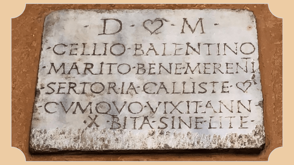 La seconda epigrafe presenta un testo più elaborato che, come per la prima, trova innumerevoli riscontri e confronti. ” D(iis) M(anibus) / Cellio Balentino / Marito Benemerenti/ Sertoria Calliste / Cum quo vixit ann(os) / X Bita Sine Lite “; ovvero : “Agli Dei Mani / A Sertorio Balentino / marito benemerito / da parte di Sertoria Calliste / con il quale visse anni / dieci di vita senza lite”. Medesima apertura di testo, e quindi medesimo contesto di pertinenza, si tratta di una dedica da parte della moglie Sertoria Calliste, il cognomen è un grecanico, sintomo di una provenienza straniera della donna, forse una prigioniera di guerra tradotta in schiavitù e poi manumessa o semplicemente una straniera a Roma che ha sposato un romano. Errore di trascrizione nel cognomen del defunto la b e la v venivano spesso traslitterate, stessa disattenzione per la parola vita scritta bita. La presenza della fogliolina di edera, deliziosa, come segno distinguente tra le parole è una variante al triangolo visto nella precedente epigrafe. La formula di chiusura sine lite, è molto comune e vuole sottolineare un rapporto coniugale all’insegna del reciproco rispetto e amore della durata di ben dieci anni di vita insieme. Anche in questo caso il contesto doveva essere elevato, forse erano dei commercianti, l’iscrizione di forma rettangolare, dove essere collocata all’interno di un colombario o di una mausoleo.