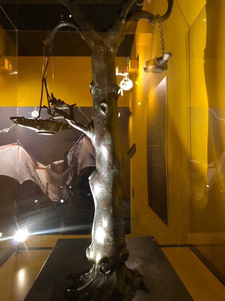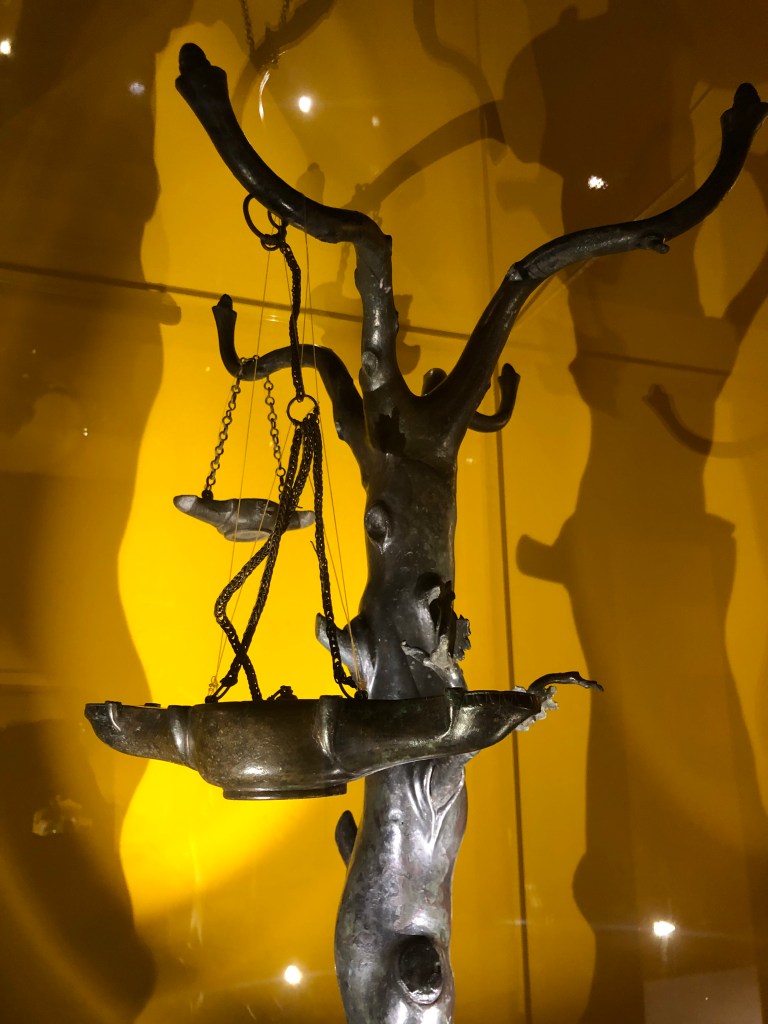 La mostra è un piccolo gioiello, già protagonista di una visita di Hedera Picta a luglio (e in replica a Ottobre); gli oggetti selezionati sono di altissima qualità e provengono tutti da Pompei o Ercolano, essi testimoniano il grado di raffinatezza raggiunto nella produzione di questi oggetti, compagni del quotidiano, che da suppellettili di prima necessità, lampade per illuminare gli spazi, si trasformarono in veri e propri elementi di arredo e corredo delle ricche abitazioni signorili dell’upper class campana dotandosi di uno stile e di un design che li rendevano costosissimi e desideratissimi.