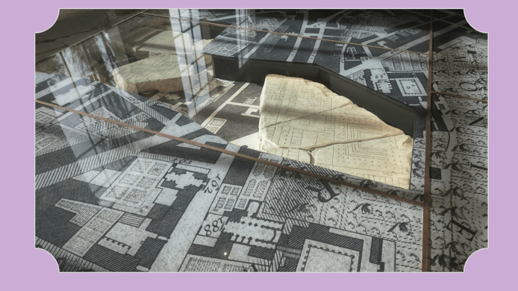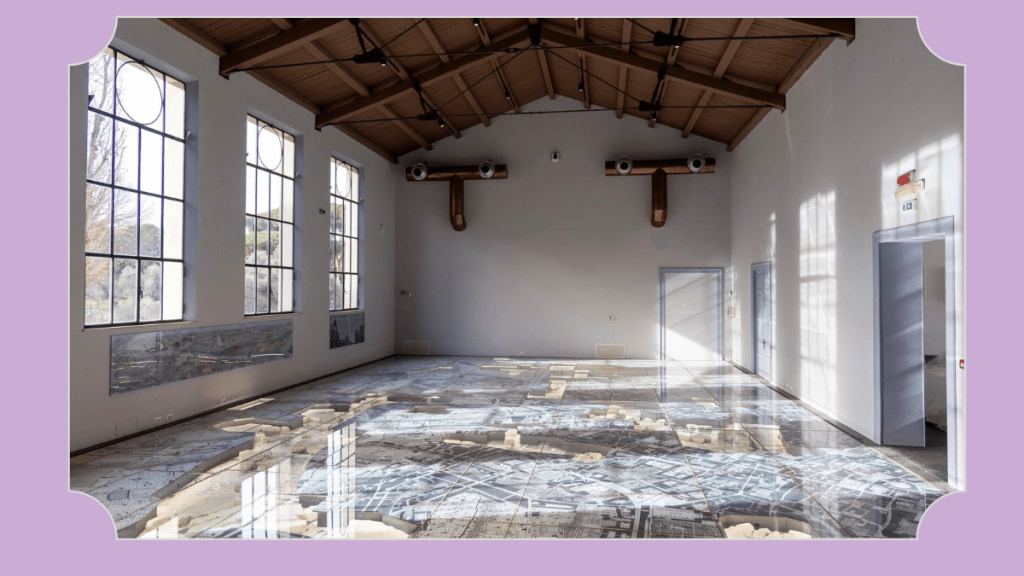 All’interno l’allestimento stupirà lo spettatore, il pavimento trasparente è realizzato con una riproduzione della pianta di Giovanni Battista Nolli del 1748 e al suo interno sono sistemati alcuni dei frammenti originali della Forma Urbis nella posizione corrispondente a quella originale se la pianta fosse completa. Ai lati della sala vedute aeree della città. Una pannellistica interna racconta la cronologia dei ritrovamenti e il luogo del ritrovamento stesso invitando a riflettere sul ruolo dell’archeologia nella riscoperta e conoscenza del passato di Roma.