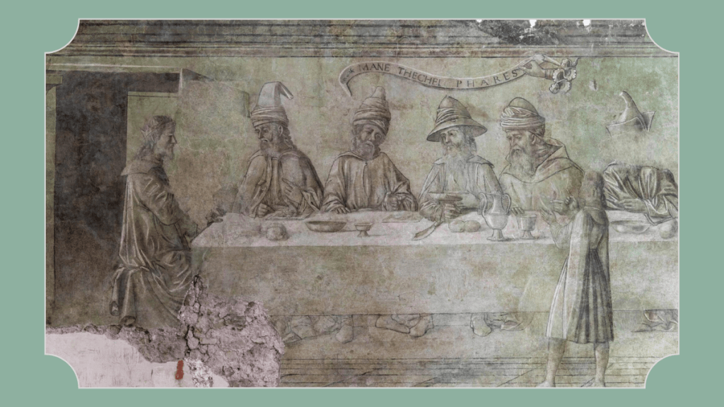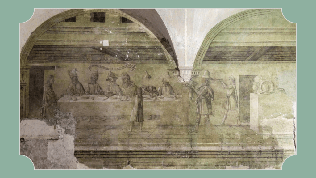 Nel corso dei lavori di restauro, l’inaspettato ritrovamento di un affresco della fine del’400 di cui si sta occupando da oltre un anno il prof. Antonio Forcellino, noto per il restauro del Mosè di Michelangelo e delle Sibille di Raffaello, raffigurante il Banchetto di Baldassarre, episodio tratto dall’Antico Testamento, quando il re di Babilonia, durante l’assedio alla sua città, imbandisce una tavola opulenta, anziché provvedere alla sua difesa.