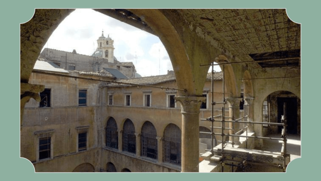 Quante volte vi sarà capitato di percorrere via del Governo Vecchio, nel cuore del rione Parione, deliziosa e storica stradina che collega piazza Navona con il Banco di Santo Spirito e il Vaticano e notare, in corrispondenza del civico 39, un portone vecchio e maltenuto che, a dispetto del suo status attuale è custode di cospicua bellezza e di una storia lunga secoli. Il portone, alto e possente è incorniciato da un motivo a punta di diamante ripreso dalle formelle che decorano i due battenti, perdute nella parte sinistra e mal conservate nella metà destra, a lato del portone una bella targa recita; ” Pretura di Roma – Servizi Civili e Sezione Penale” mentre sulla facciata una preziosa targa con il volto del Salvatore ricorda la donazione del Cardinale Nardini all’Arciconfraternita Ospedaliera del Salvatore al Laterano che vi fondò il famoso Collegio Nardini. Lo stabile, abbandonato dal 2010 è finalmente in corso di ristrutturazione, prevista per il 2025 la sua rinascita.