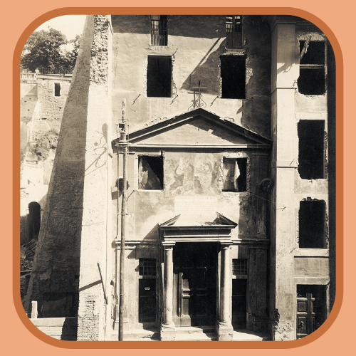 Tra le sorprese riservate dal restauro figurano i ritrovamenti degli stucchi della demolita chiesa di Sant’Orsola e Santa Caterina, nota come la chiesa de Tor de’Specchi, in quanto si trovava lungo la via di Tor de’ Specchi, l’odierna via del Teatro di Marcello, vicino al versante occidentale del colle. Un’iscrizione del 1180, attualmente nel cortile di Palazzo Venezia, menziona la consacrazione dell’altare di questa chiesa. Viene menzionata nel catalogo di Cencio Camerario del 1192, con il nome di Sco. Nicolao Funariorum, con riferimento ai fabbricanti di funi che vivevano nel rione e che, come da consuetudine, eleggevano una chiesa quale punto di riferimento della confraternita che li univa e li tutelava nello svolgimento delle loro attività; in quelle chiese la confraternita celebrava battesimi, matrimoni, funerali e ne conservava lo stato interno ed esterno. . In una lista di chiese compilata nel 1492, viene citata come S. Nicolai in sinistra scalae Arae Caeli.