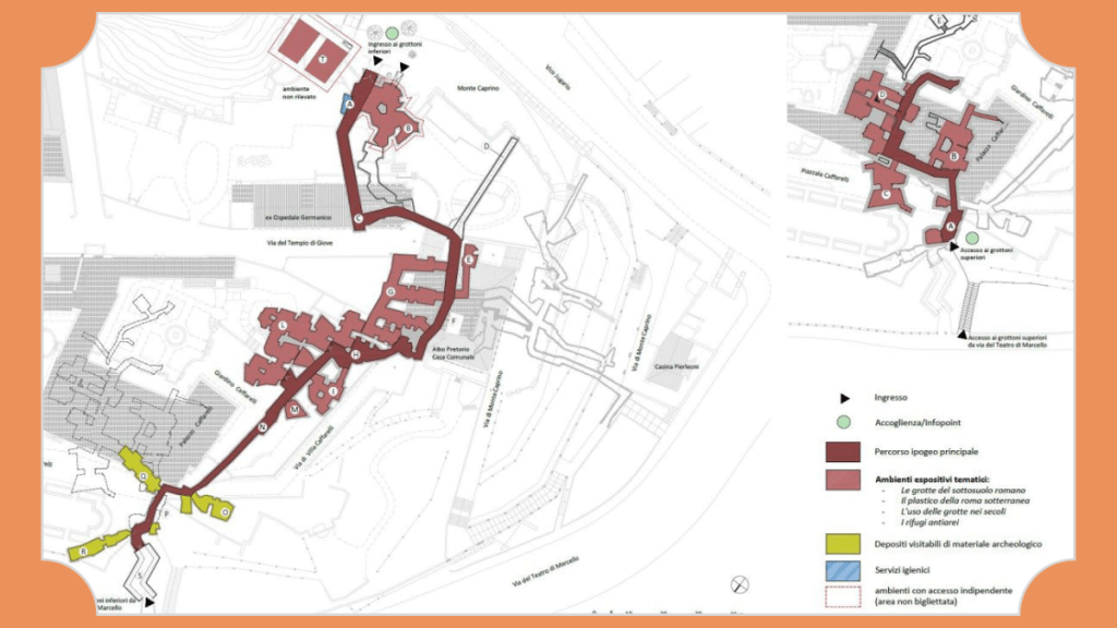 Il progetto dei Grottoni del Campidoglio, prevede interventi di restauro conservativo e di valorizzazione dei percorsi e delle cavità sotterranee che si snodano all’interno del colle attraversandolo in diverse direzioni e su più livelli. L’eccezionalità delle condizioni di visita e di specificità del luogo, permette di promuovere forme di turismo alternativo, tra archeologia e speleologia, rendendo visitabili i depositi archeologici, con allestimento di Antiquarium e Lapidarium e raccontando attraverso istallazioni multimediali la natura delle cavità sotterranee di Roma.