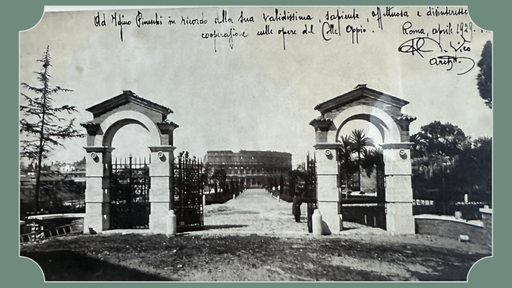 -Parco del Colle Oppio (1926-1932), di circa 20 ettari, al di sopra dell’area occupata dalle Terme di Traiano e dalla Domus Aurea neroniana; aggiungo una curiosità: nel corso dei lavori fu scoperta una sorgente e ciò gli fornì lo spunto per arricchire il parco di fontane e giochi d’acqua, caratterizzati da un ricchissimo insieme di sculture; in foto l’ingresso dei giardinetti su via Borghi, con dedica di Raffaele de Vico a Igino Pineschi, architetto, docente di Disegno e rilievo e di Progettazione architettonica e urbana, suo collaboratore)